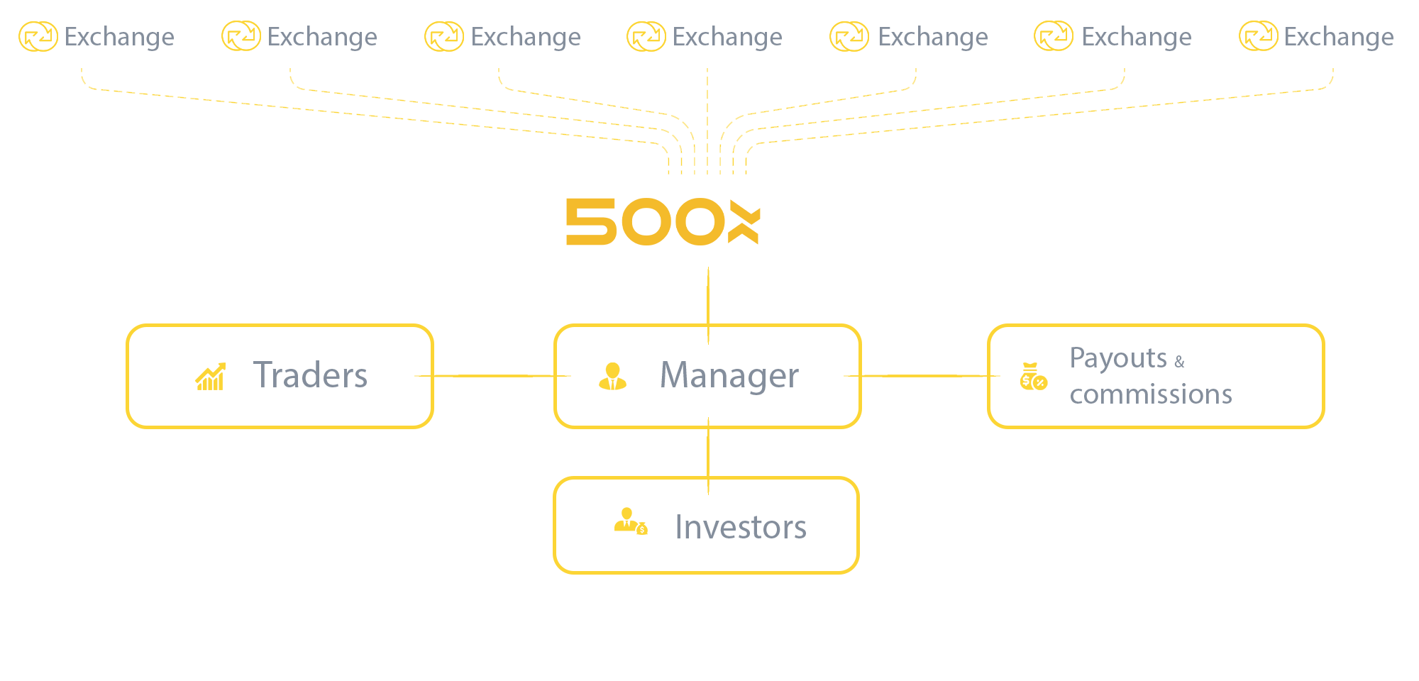 Receive access to over 80 exchanges around the world. 500x Platform can be linked to global financial exchanges and popular liquidity providers. Gateways are easy to manage: control and re-structure your business, manage risks, generate reports, receive quotes, and handle withdrawals.
