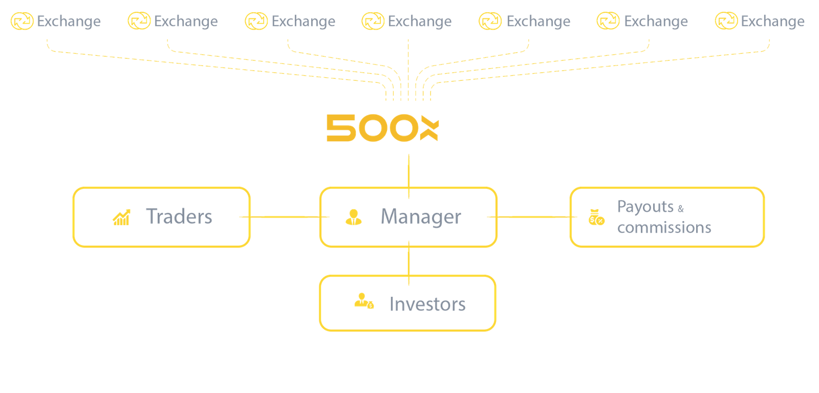 Receive access to over 80 exchanges around the world. 500x Platform can be linked to global financial exchanges and popular liquidity providers. Gateways are easy to manage: control and re-structure your business, manage risks, generate reports, receive quotes, and handle withdrawals.