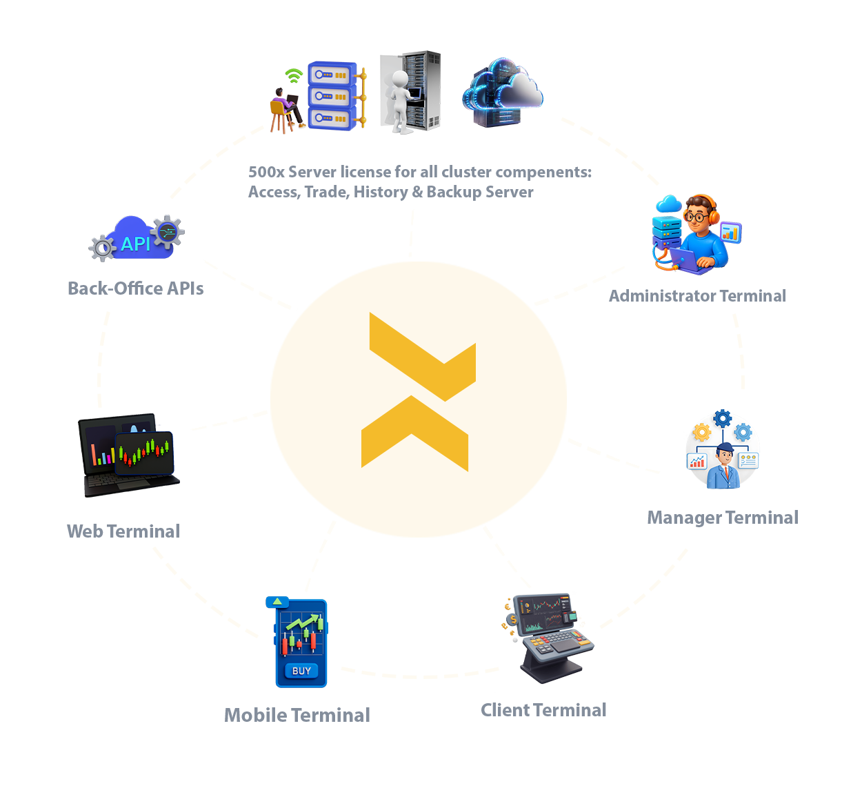 Licenses for access, trade, history and backup servers — ensures smooth operation and helps restore data in cases of failure.